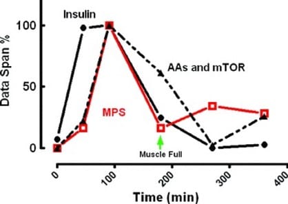 Eine Studie von Atherton & Smith (2012) über die Muskelproteinsynthese und die Reaktion auf Nahrung und körperliche Aktivität hat ergeben, dass ernährungsbezogene Erhöhungen der MPS über eine begrenzte Zeit (etwa 1.5h) stattfindet. Nach dieser Phase scheint die MPS sich wieder auszuschalten. Man spricht hier von einem “Muscle-Full Set-Point”. Dieser Set-Point kann mit Krafttraining verzögert werden und stellt eine größere „anabole“ Wirkung dar als Ernährung allein.